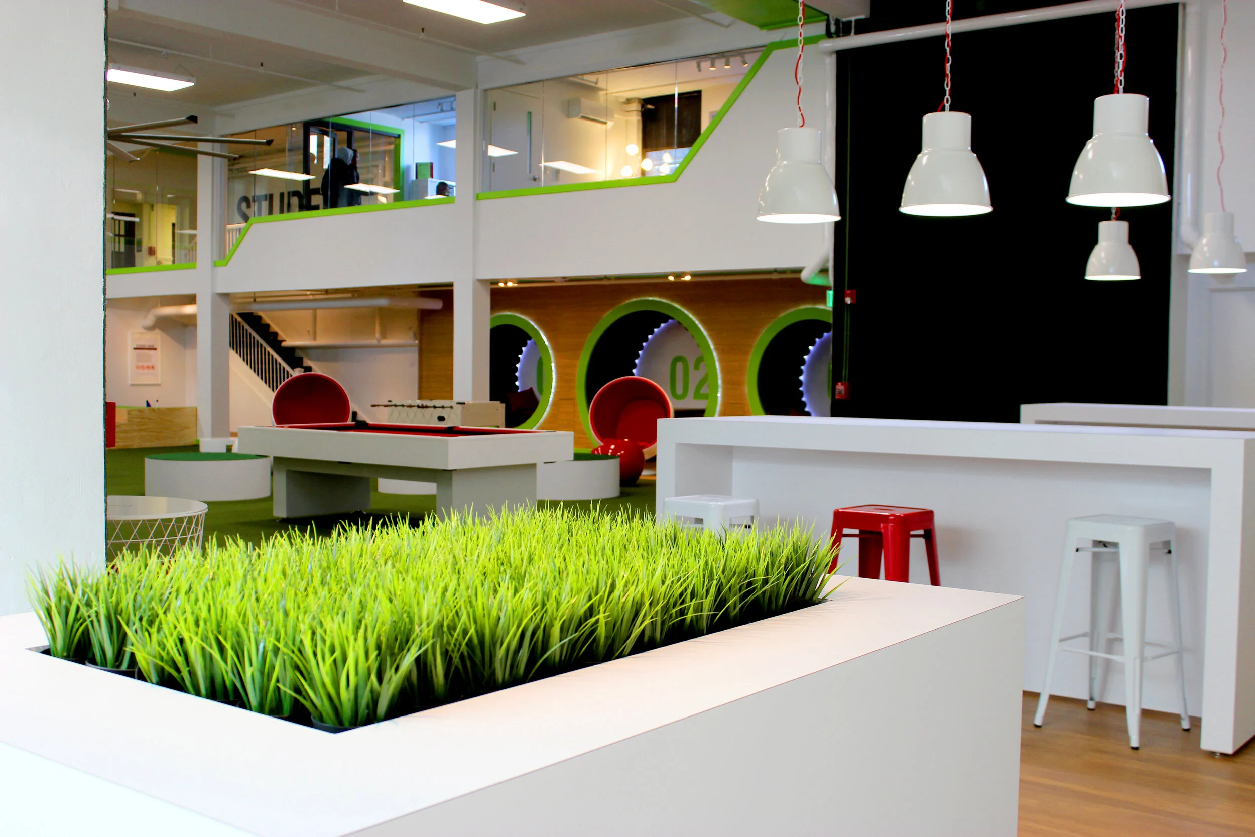 Adding artificial grass in the eating area will increase the feeling of healthiness. Replacing painted walls with performance turf walls, which will help to absorb sound, making this space tend to be quieter.