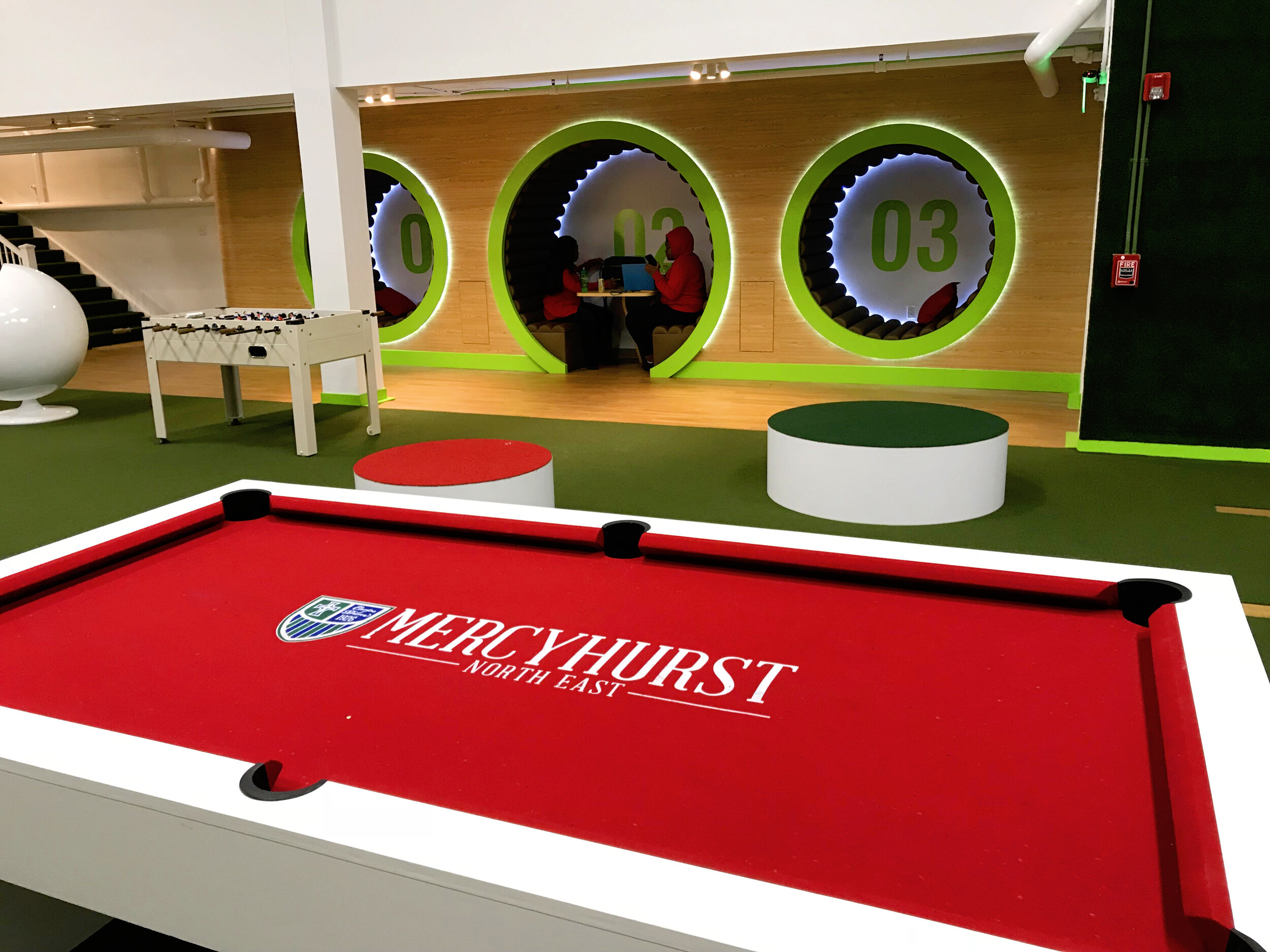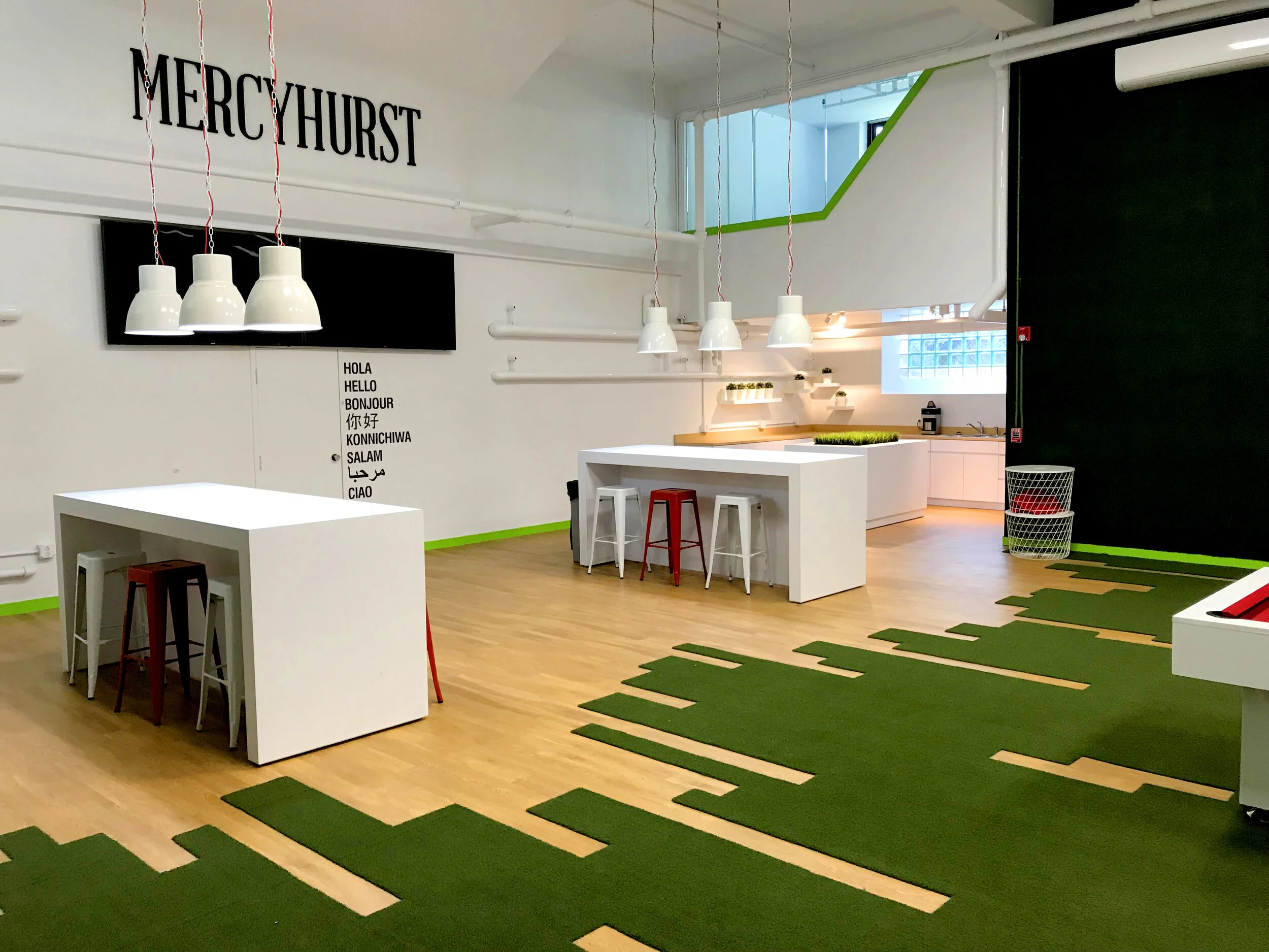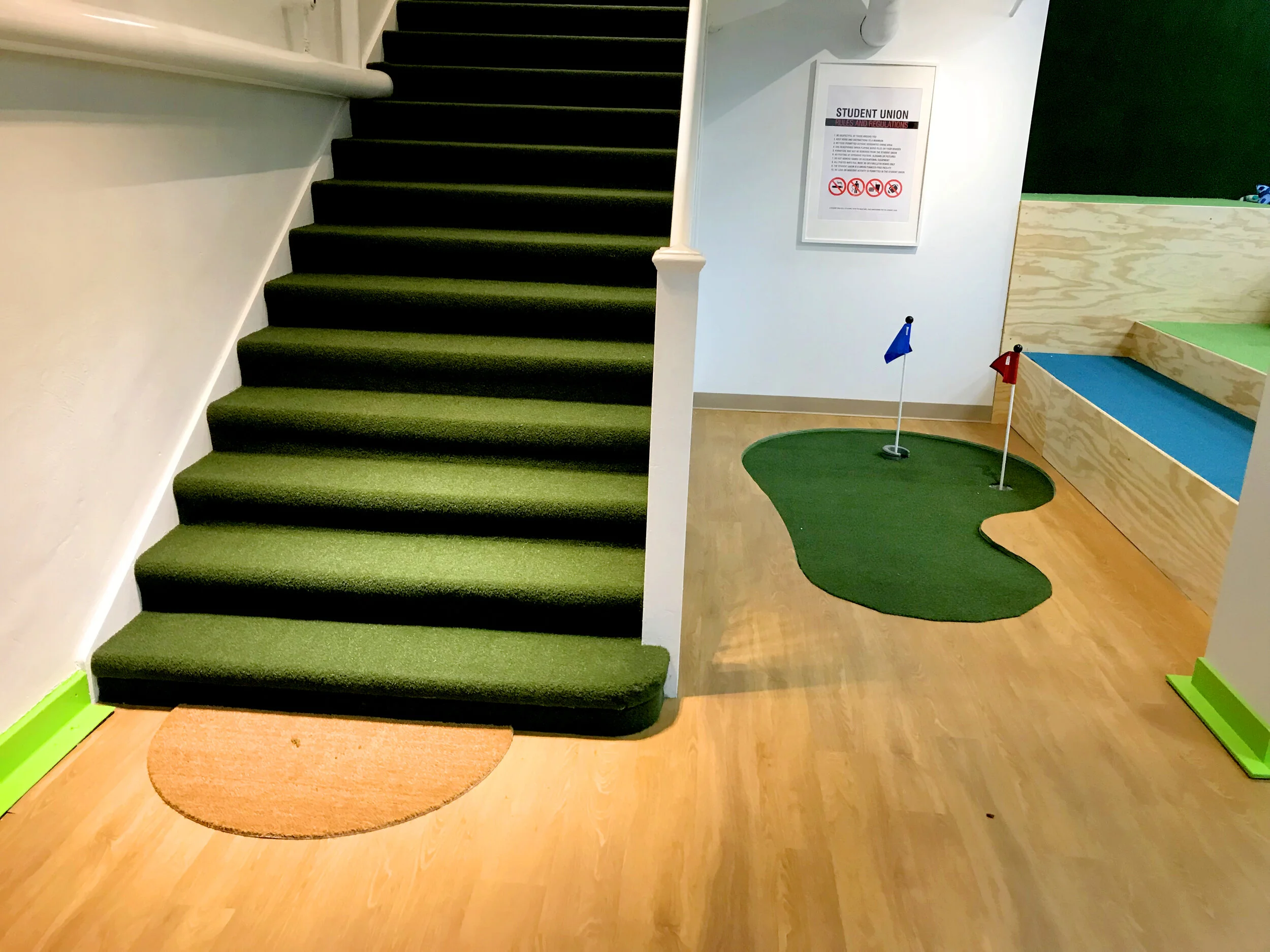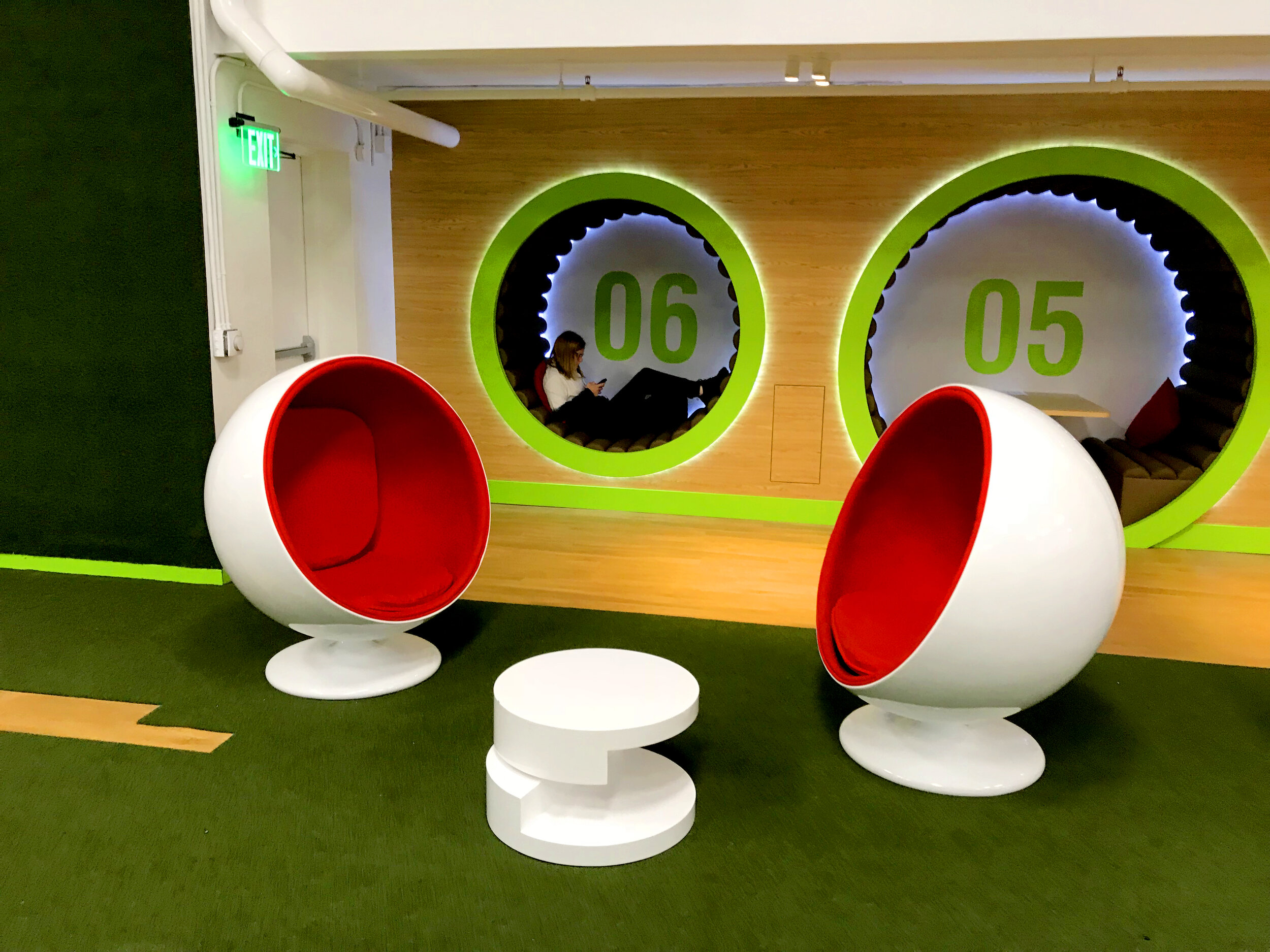 Custom-made curved LED lighting is added to the circular rings. This will notify when the study pods are occupied. Bringing in natural elements from a child’s playground into the space and replace carpet with performance turf, representing natural grass.