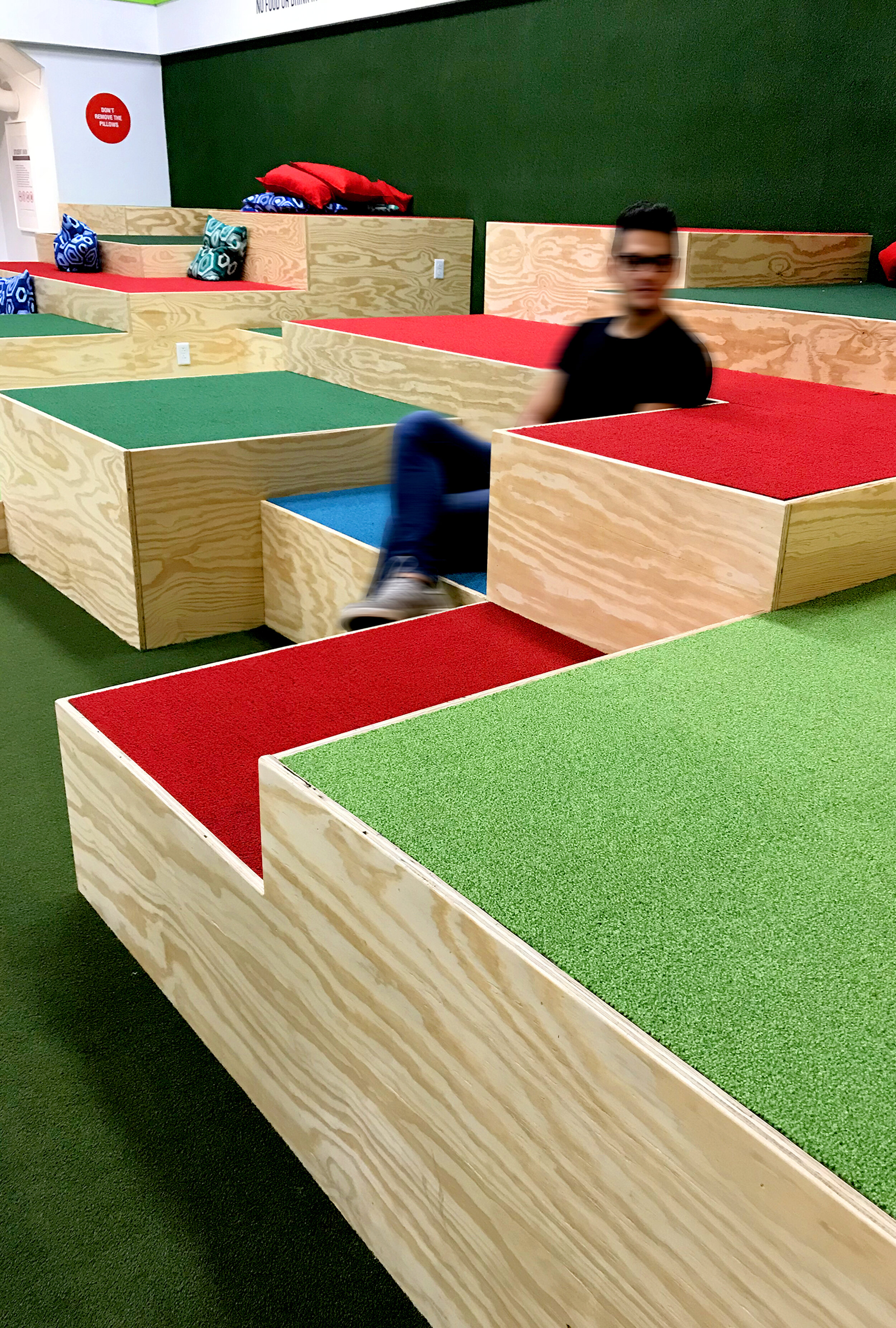 Multi-level platforms where students can hang out, chitchat, create their own seating and discuss their ideas. Extrovert