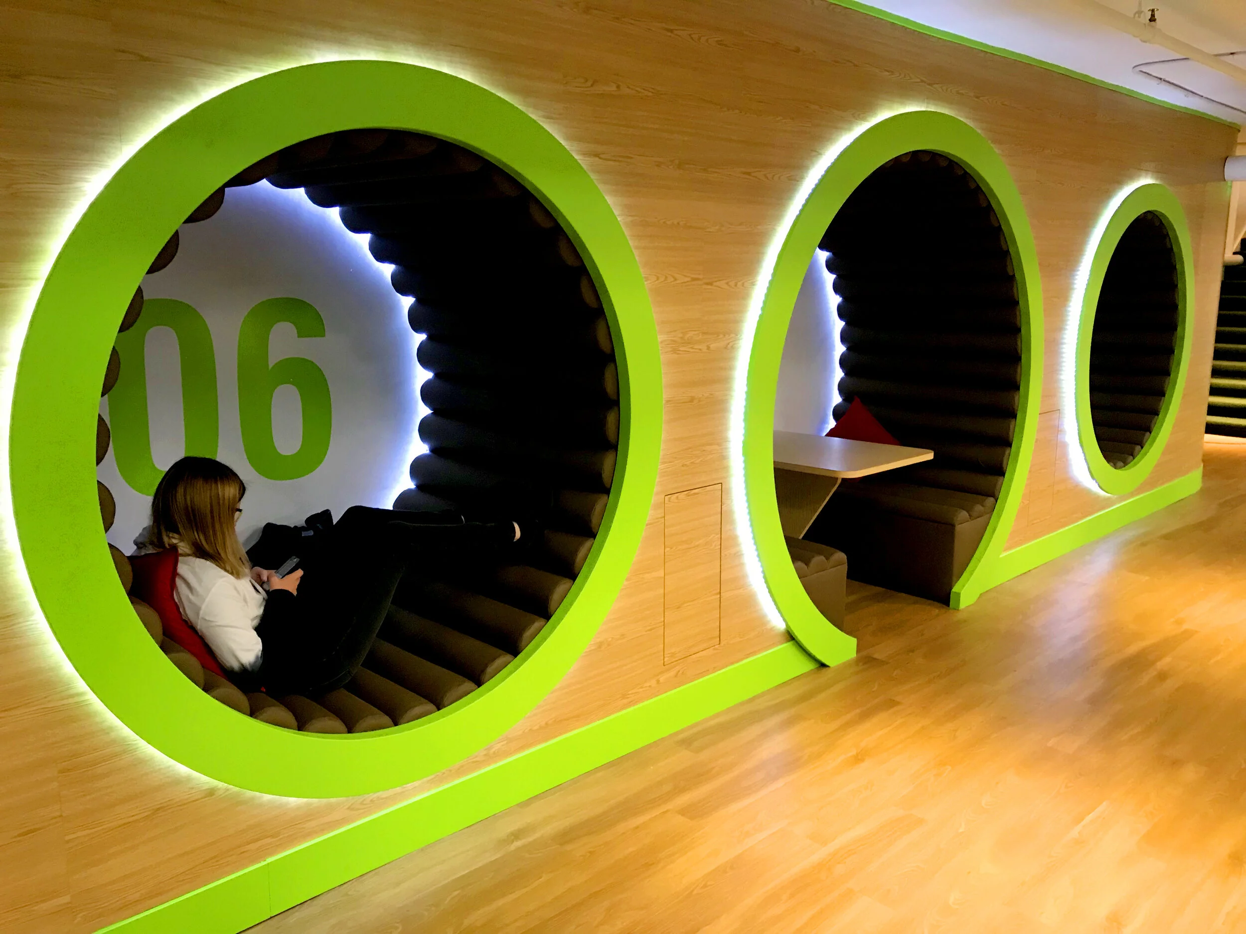 Circular, custom-made cushions have been placed around the diameter of each pod, absorbing sounds and making each pod a quiet place to study. Replacing typical drywall with a glass wall will increase the desirable view and internal connection.