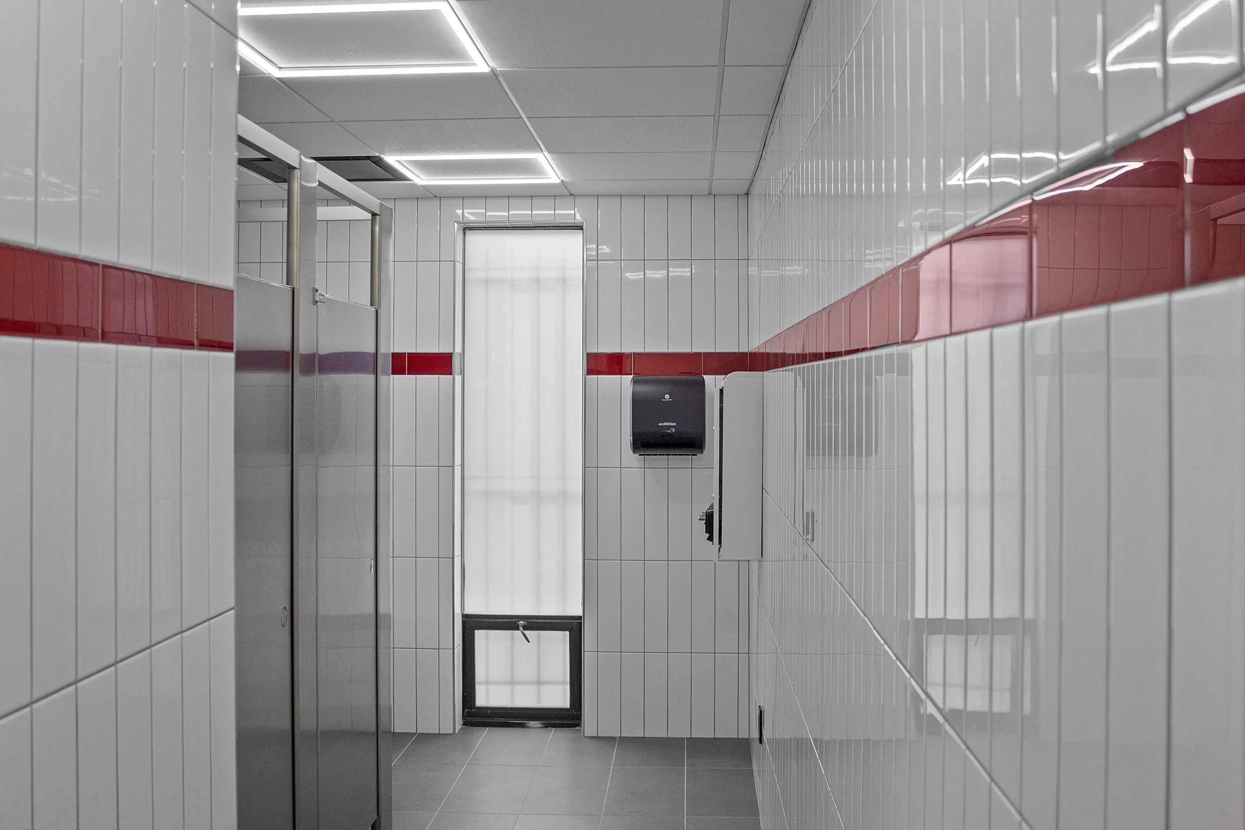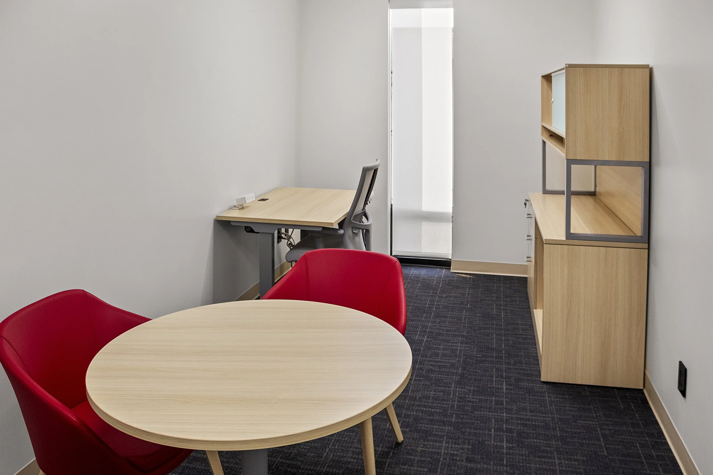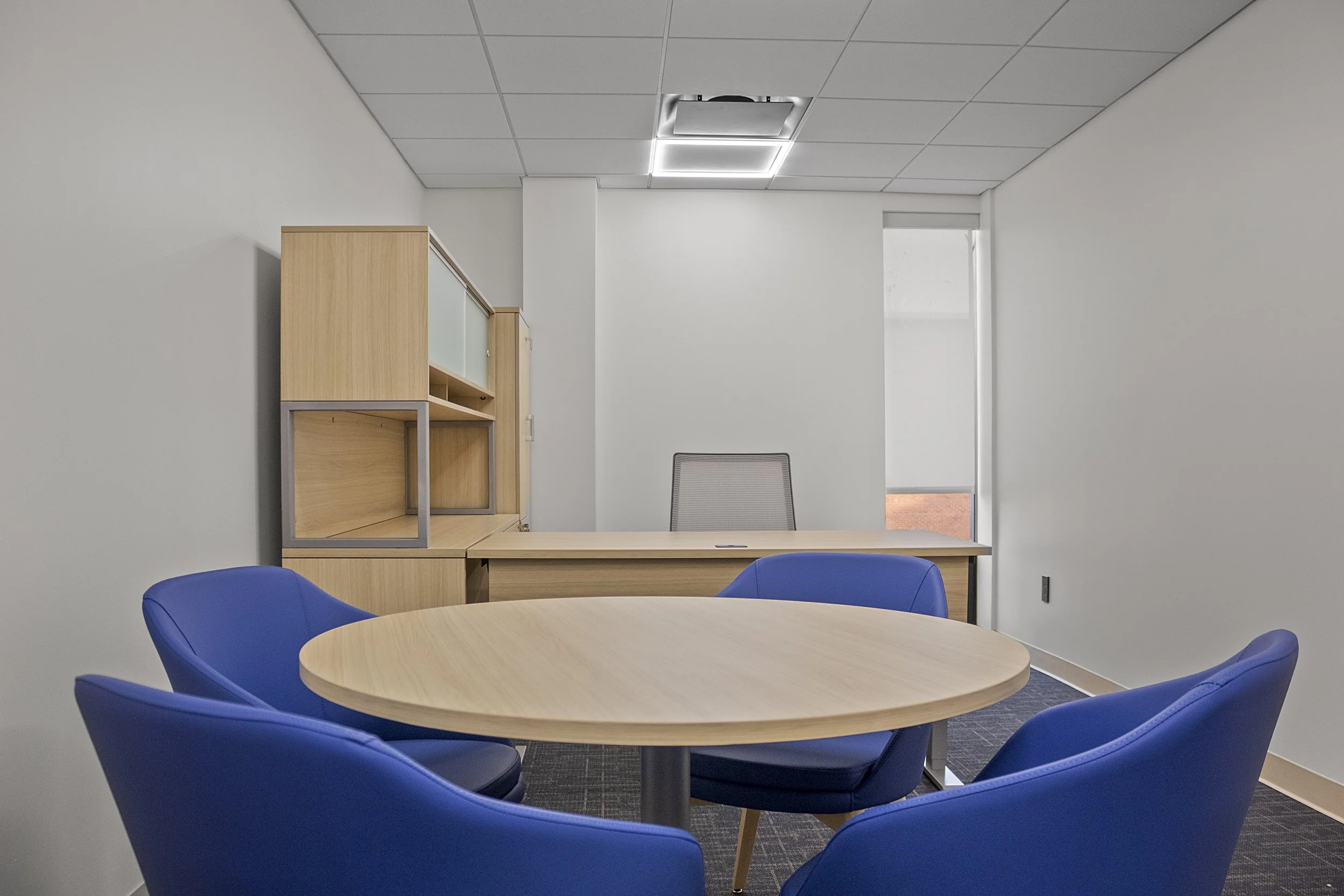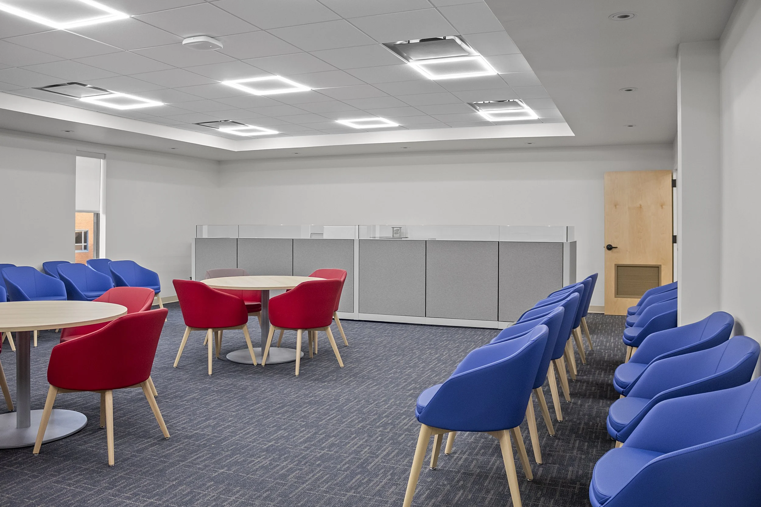 A distinctive feature of the design is the intentional use of blue and red hues, representing the client university’s official colors. These colors are thoughtfully integrated throughout the building—in wall accents, furnishings, and architectural details—to reinforce institutional identity and foster a sense of pride and belonging among students and staff.